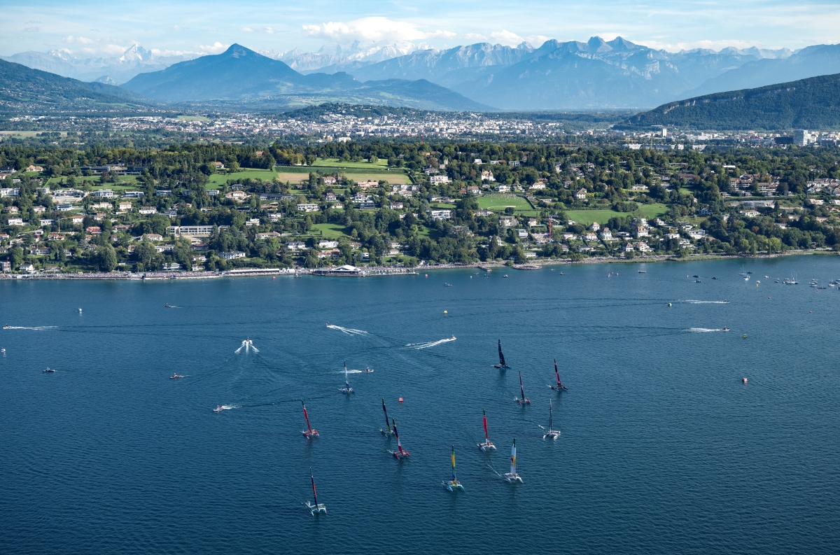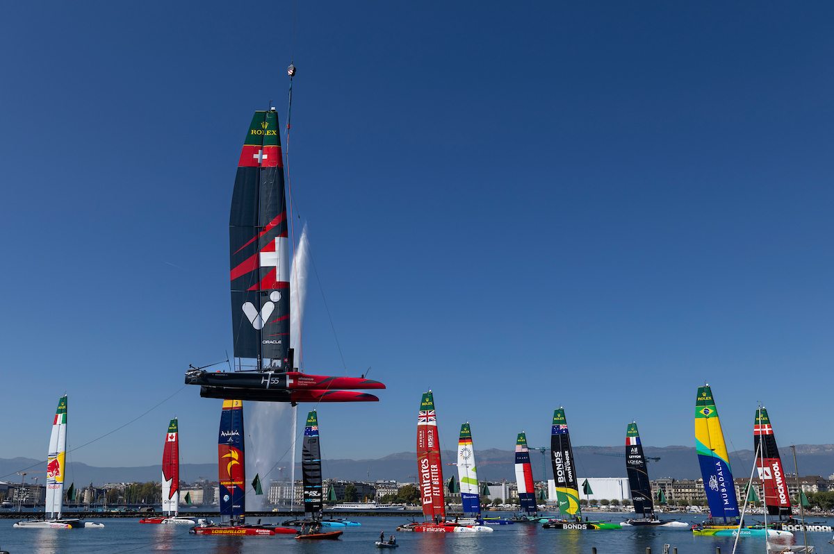 Genève a accueilli la dixième étape de la saison 2025, au cours de laquelle les 12 équipes internationales ont dû faire face à des conditions difficiles et à un vent faible. Pour la première fois, les équipages ont couru une configuration spéciale pour le vent faible et des T-Foils, tout en s’adaptant à un équipage réduit à trois personnes au lieu des six habituelles à bord.